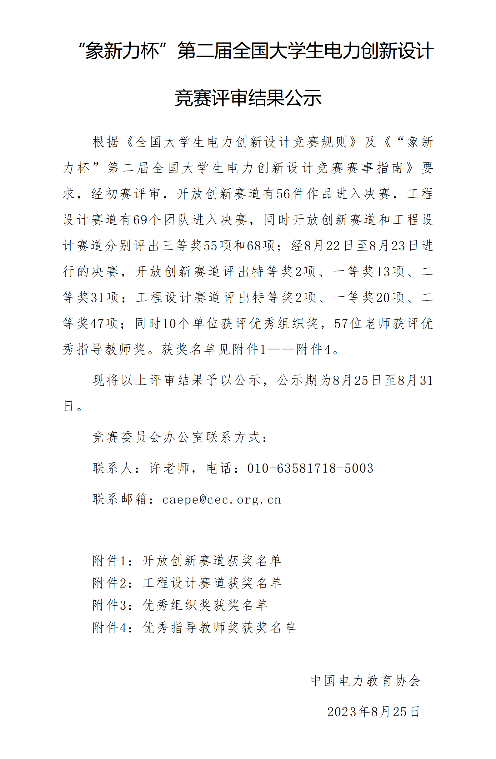 第二届全国大学生电力创新设计竞赛评审结果公示 发布时间:2023-08-25 21:47 浏览量:2245 附件1:开放创新赛道获奖名单.pdf附件2:工程设计赛道获奖名单.pdf附件3:优秀组织奖获奖名单.pdf附件4:优秀指导教师获奖名单.pdf