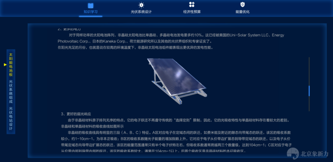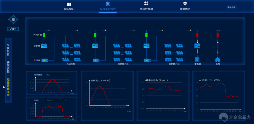 分布式光伏认知选型及设计运行虚拟仿真软件,首先学习电池组件的构成、制备过程,光伏系统的各组成部分等基础知识,再通过实验方法掌握不同组件的光伏特性,并从中了解其开路电压、短路电流、填充因子和转换效率等重要参数。其次,根据不同场景实际负载的需求,上海市每个月阴雨天气数和日平均用电量,计算出需要的蓄电池的容量。根据蓄电池的型号参数,计算出蓄电池的数量,并进行安装。最后,学生以上述条件自行设计一套能够满足各项要求的光伏发电系统,并能根据此系统进行必要的经济性测算。