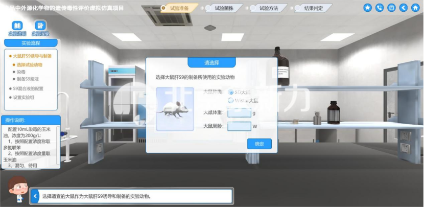 本实验是以动物实验室组成、管理及遗传毒性试验设计、操作为原型,以解决实际教学问题为目标,综合利用3D建模、动画、计算机仿真、网络通信、动物实验室管理与遗传毒性试验技术等研制而成,为学生提供了一个真实的动物实验场景实验平台。