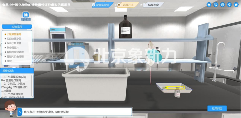 微核试验模块包括设置试验组、试验方法、结果判定等。其中试验方法内容包括小鼠灌胃染毒、脱臼处死小鼠、取出小鼠骨髓、制备骨髓片、骨髓片固定处理、骨髓片染色处理及镜检等关键步骤。