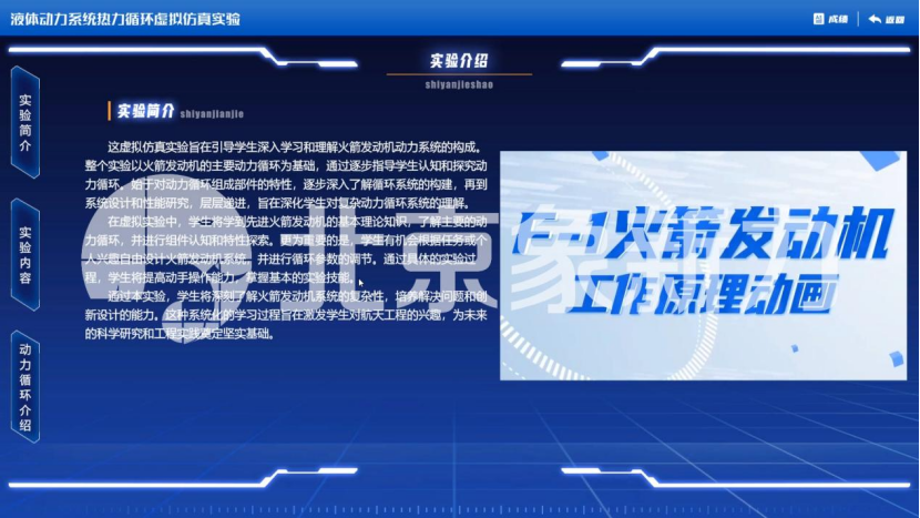 “实验介绍”模块可了解火箭发动机系统性能探究实验的实验目的,实验内容,学习动力循环的相关理论知识。