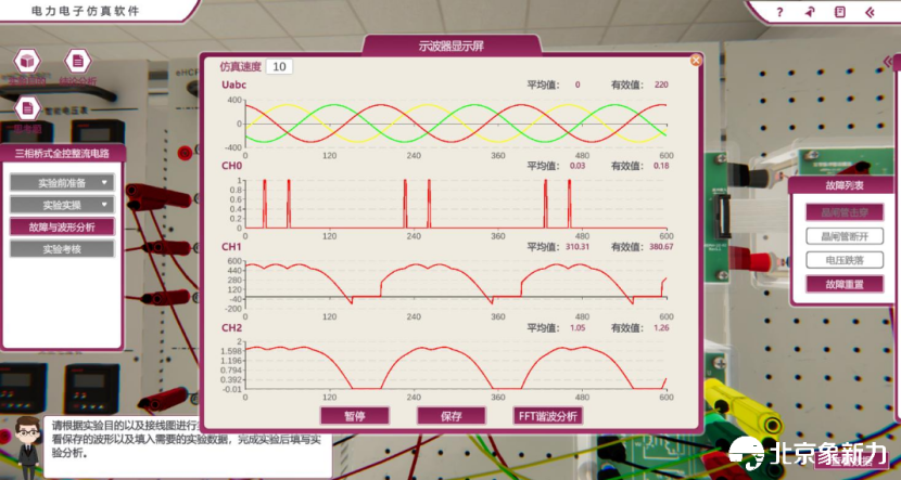 故障模拟与分析:内置多种故障场景(如晶闸管击穿、断路、电压跌落等),帮助学生进行故障诊断与排除。