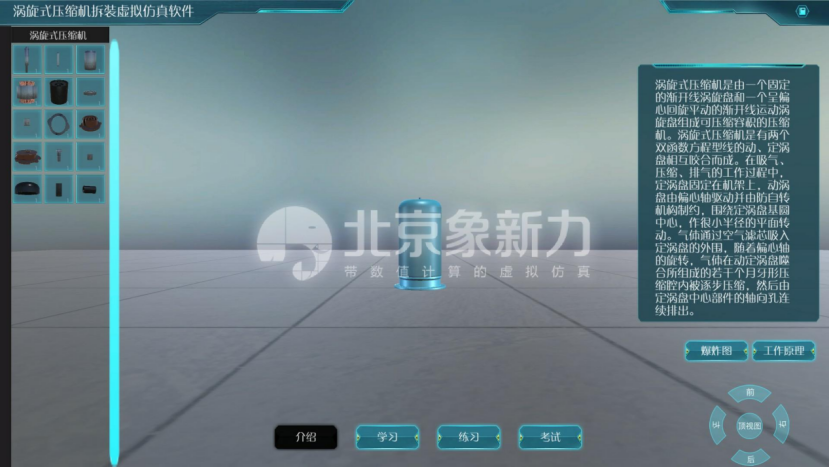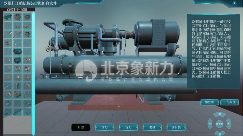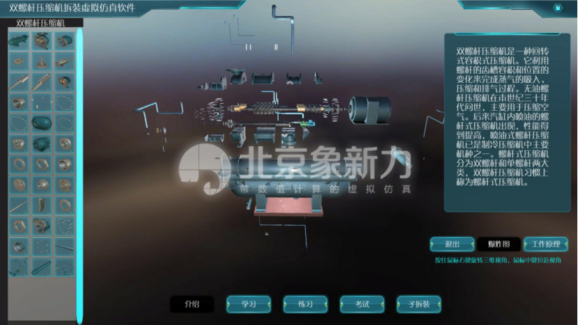 系统提供了活塞式、单螺杆式、双螺杆式、涡旋式、离心式这 5 种常见类型的压缩机供学生拆装学习。并且针对每种压缩机的拆装,都设置了介绍、学习、练习、考试 4 种模式。