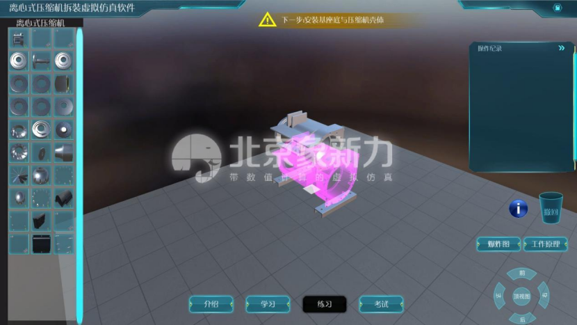 练习模式下,学生在系统提示下将零件拖到设备台进行组装,设备台还会显示零件的正确位置提示,帮助学生实际演练压缩机组装全过程,极大地锻炼了动手能力,加深对设备结构组成的理解;