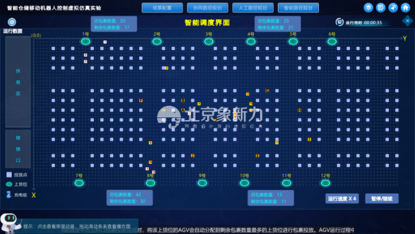 用户选择“多 AGV 协同调度”模块,可进行场景配置,使系统能够在最短时间内完成全部包裹的投放。还可进行多AGV 协同控制、多AGV人工调度、多AGV智能调度实验。