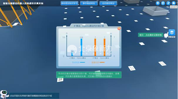 用户选择“智能路径规划”模块,系统会介绍 A*算法、Dijkstra 算法、智能避障算法等相关知识点,并进行静态路径规划、动态路径规划。