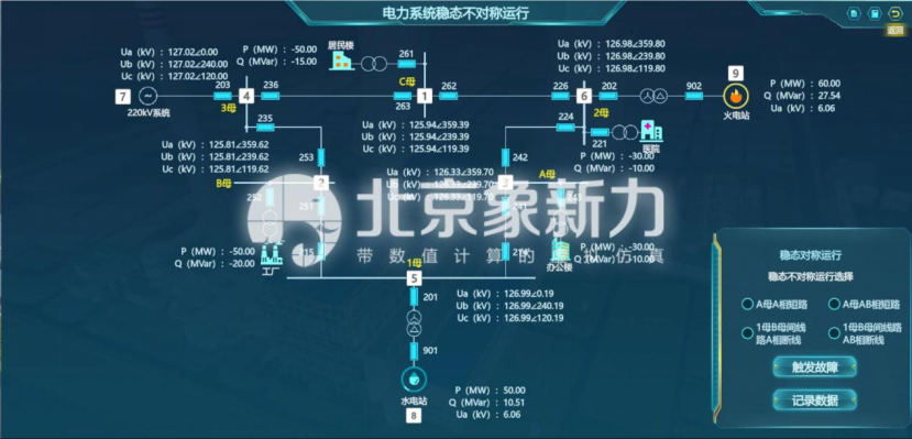 学生通过选择不同稳态不对称运行方式,触发条件后,可观察不同方式下IEEE9节点系统图中各节点的数据、各种故障现象以及潮流变化情况。