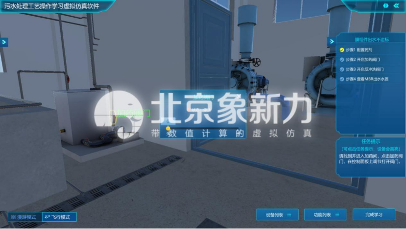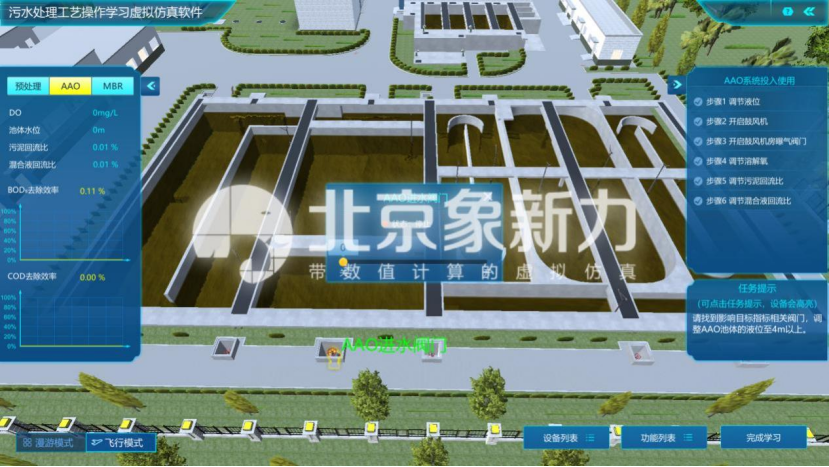 在任务栏中依次领取故障任务,任务包括膜组件出水不达标、AAO溶解氧偏低和污泥回流比异常等,任务领取后进入操作。进入故障任务三维场景,根据实验引导完成故障任务的处理,培养学生对污水处理厂常见异常情况的处理能力。