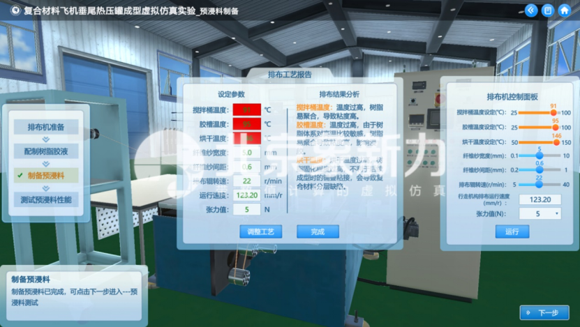 进入第二模块预浸料制备实验,调控纤维排布的树脂温度、浸胶温度、烘干温度以及排布速度等参数,对比不同排布参数下预浸料的性能,获得较优的排布参数,让学生掌握排布工艺参数对预浸料性能的影响。