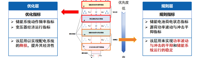为降低电网波动带来的变压器与线路损耗,并减少储能系统自身频繁动作的损耗,团队从“自制水过滤器”的结构中获得灵感,提出了复杂运行工况下的运行指标分层方法。该方法确保了功率补偿的实时性与经济性,成功将网侧线损率从3.61%降低至2.99%,实现了系统层面的大幅节能降耗。