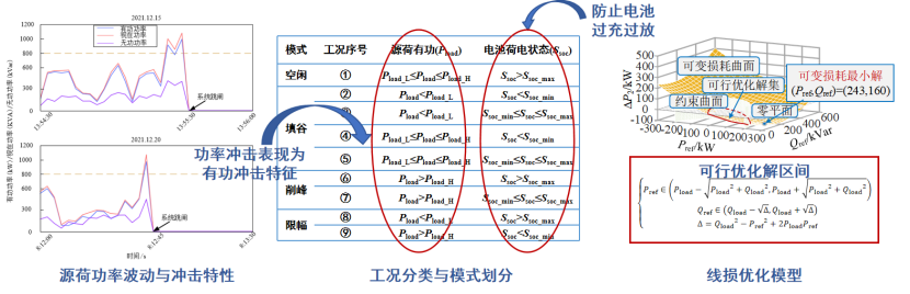 面对可再生能源与负荷的随机波动,如何实现更精细、合理的储能能量管理是一大难点。团队创新性地采用 “局部最低、整体降低” 的优化思想,结合对系统9种典型运行工况的精准划分,为储能装置在不同模式下设计了最优功率补偿值。该方法成功将源荷波动与冲击平抑率提升至95%,并将网侧功率因数稳定在0.97-0.99的高水平,治理效果卓越。
