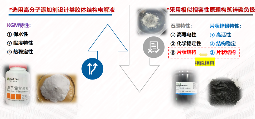 如何进一步提升负极性能?团队运用“相似相容性”原理,将高活性的片状锌粉与高导电性的石墨复合,构建了新型锌碳负极。这一设计如同为锌离子修建了均匀沉积的“高速公路”与“安全港湾”。