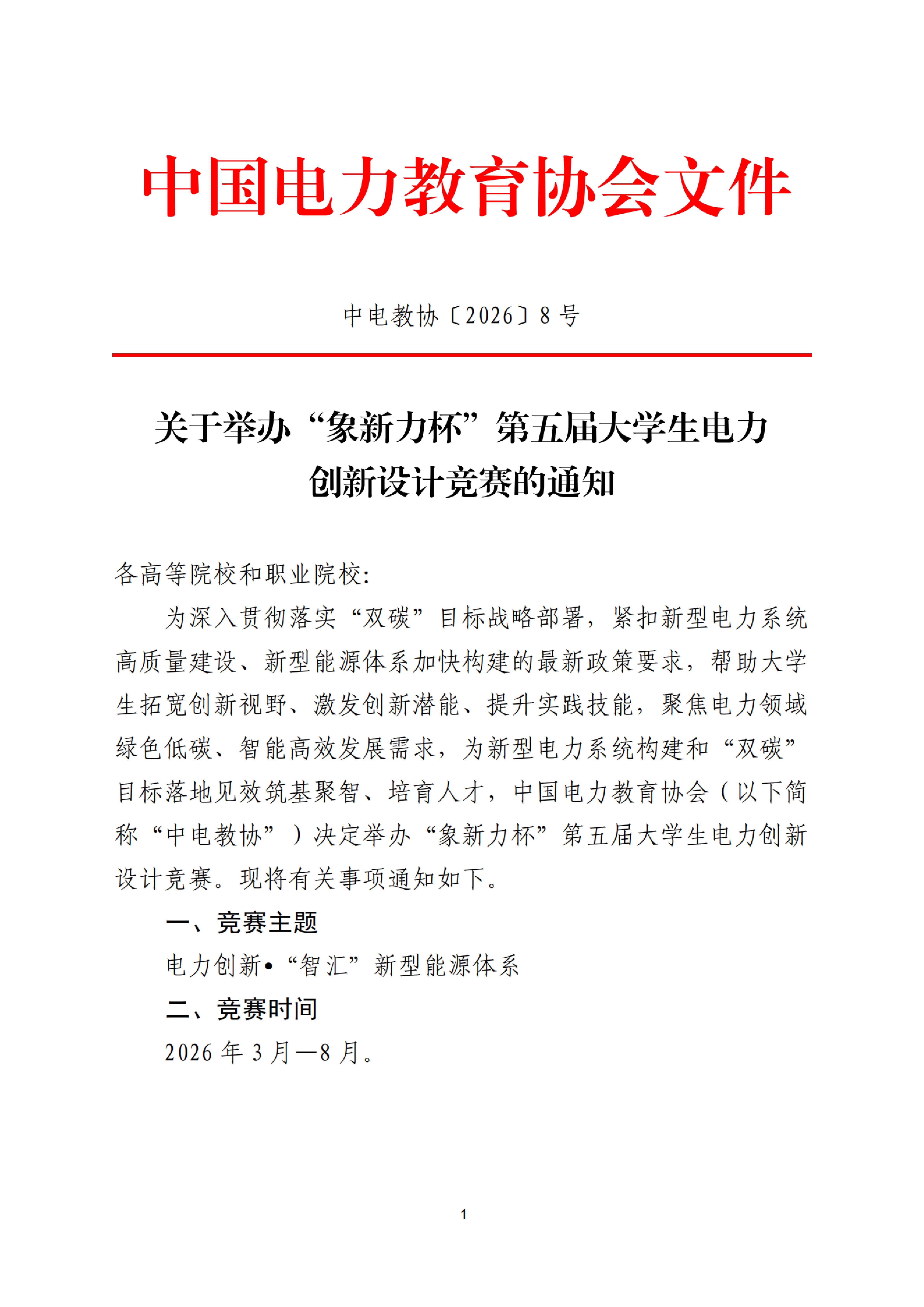 以“电力创新 • '智汇' 新型能源体系”为主题,由中国电力企业联合会为指导单位,中国电力教育协会主办,三峡大学、中电联人才测评中心有限公司承办,华北电力大学、上海电力大学、长沙理工大学、西安交通大学、东北电力大学、南京工业职业技术大学、郑州电力高等专科学校、重庆电力高等专科学校、武汉电力职业技术学院、广西水利电力职业技术学院、福建水利电力职业技术学院、中国电力出版社、《中国电力教育》杂志社协办,北京象新力科技有限公司提供竞赛技术支持的“象新力杯”第五届大学生电力创新设计竞赛定于2026年3月-8月举办,现将有关事项通知如下: