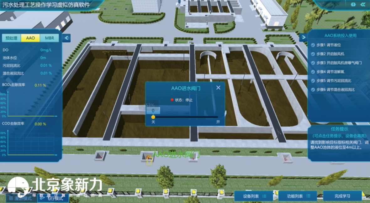 (3)内容丰富、功能完善:软件设置了漫游学习、设备巡检及工艺操作等多种模式的使用形式,内容丰富、功能完善,用户可通过任意模式完成污水处理厂相关工艺和设备原理的学习,同时通过丰富的交互形式增强用户的使用体验。