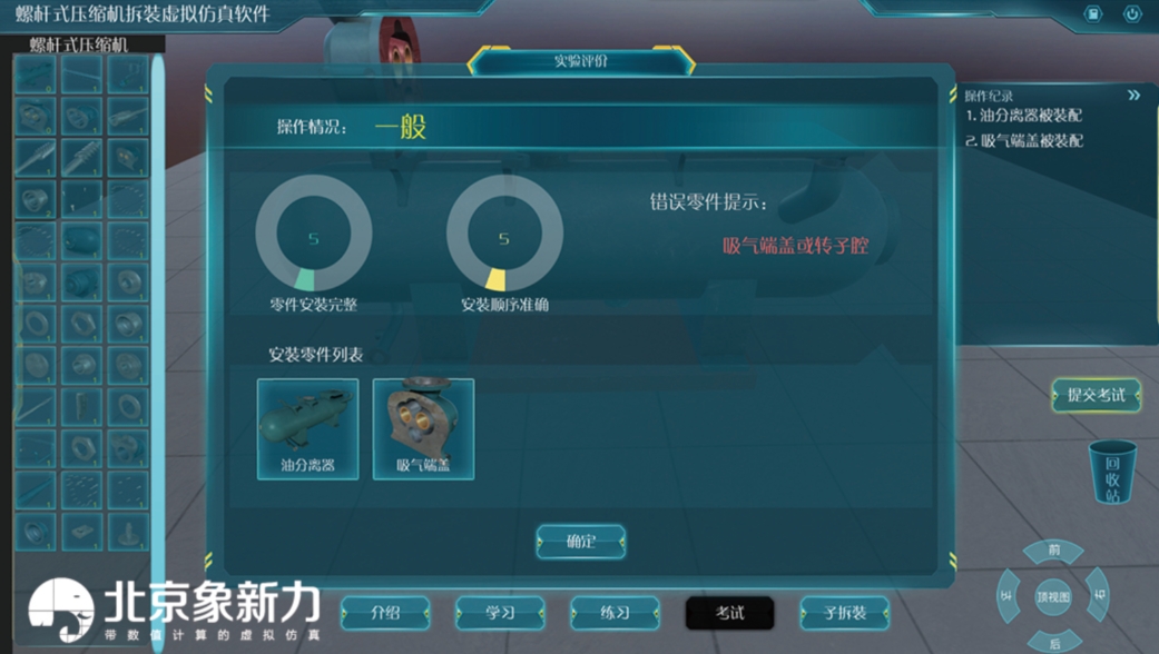在没有任何操作提示和帮助的情况下,学员进行设备组装,测试学生的掌握情况,可提交考试后在考试评价界面查看操作评分及错误提示。这有助于发现压缩机拆装虚仿实验中的常见错误,进行压缩机拆装虚仿实验结果评估。