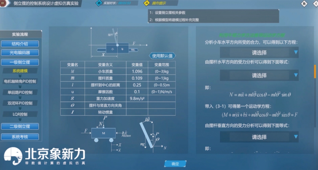 该软件的倒立摆的控制系统设计虚拟仿真实验由场景漫游、结构学习、一阶倒立摆、二阶倒立摆、考核答题五个模块组成。以一级倒立摆为主,引导实验从数学模型的建立,到线性化处理、系统状态空间方程的求解、传递函数的求解一步步分析,这也是倒立摆控制系统设计步骤的重要体现。通过这些步骤,将不稳定的倒立摆系统建立成一个可控的线性系统。并最终通过设计控制器并通过设置不同的 PID 参数进行调试,让学生通过倒立摆模型了解单回路 PID 控制、双闭环 PID 控制、LQR 控制的原理,这就是倒立摆控制系统的 PID 调节方法的实际应用。