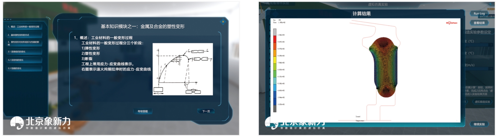 本实验项目以真实实验室设备及场景为对象,完全还原实验细节,将锻造实验操作的流程场景虚拟与测试结果仿真计算相结合。学生在虚拟实验平台上学习实验原理及操作方法,同时掌握各种锻造指标及不同材料的性能差异。通过这种方式,学生可以更深入地了解零件热锻中的变形工艺分析、热锻成形对材料性能的影响等知识。在虚拟实验中,学生可以观察到零件热锻变形后的显微组织观察、零件热锻后显微组织演化过程等微观现象,从而更好地理解零件热锻的变形与再结晶机制。