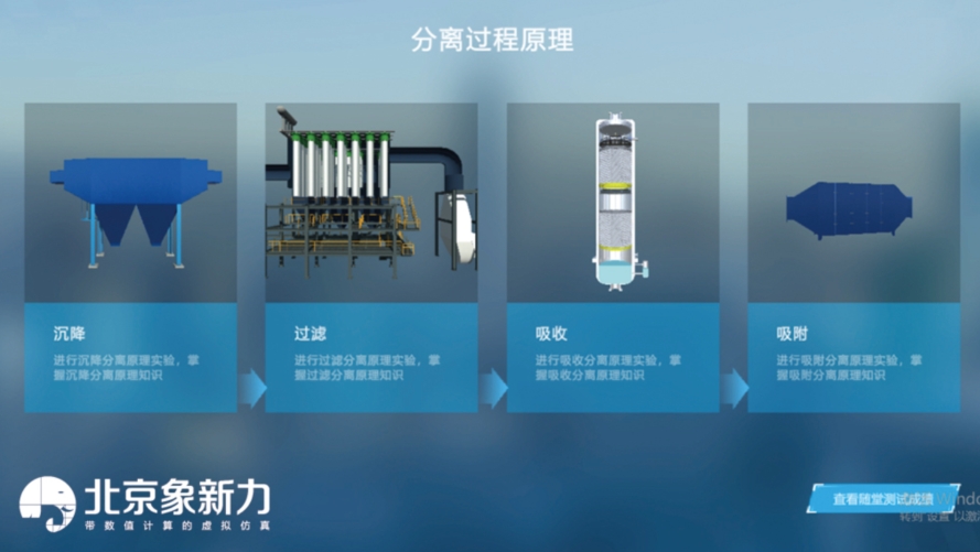 多形态复杂烟气污染净化创新虚拟实验将《环境工程原理》课程中分离过程原理的“沉降”、“过滤”、“吸收”、“吸附”四大核心模块进行可视化、模块化、可搭建化,通过三维构建与数值模拟将系统设计、实施以及性能评价三方有机结合,为学生身临其境的认知大气净化设施的结构、原理和效率的影响因素提供了一个高仿真度、高交互式和全程参与式的虚拟操作平台。