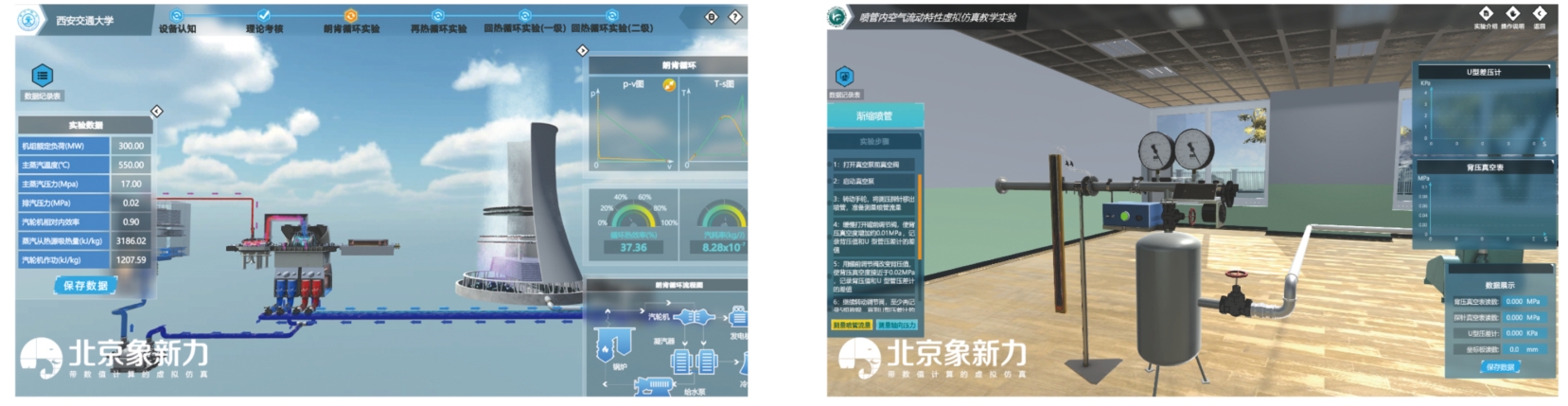 实验设备、实验器材、测量表计等装置均与实际实验室相符。泵、阀门、喷管、管道的外观与真实设备一致。设备运行时伴随有设备转动、震动、指示灯开启等现象与现实一致。实验中对设备的操作也与真实操作相一致。学生可以通过在线工程热力学虚拟仿真实验,如同置身于真实的实验室中,感受工程热力学实验的魅力。