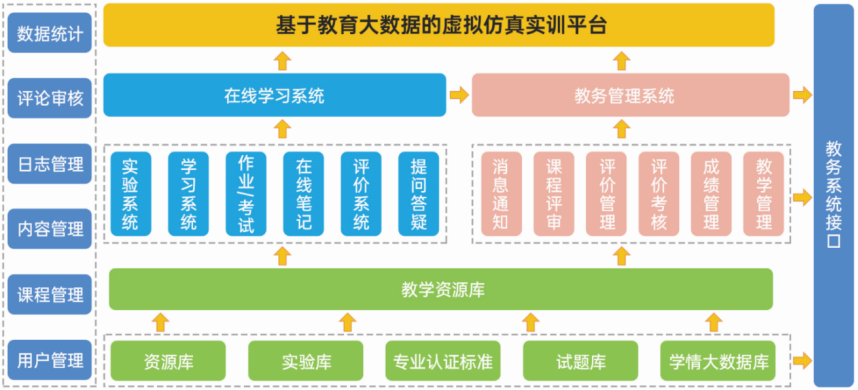 基于教育大数据的虚拟仿真实训平台是针对当前院校教学应用与管理的痛点及难点,采用B/S网络架构搭建以学校为一级门户、校院两级共建共管,实现教、学、管、考、评一体化的开放共享型综合管理平台,以体系化的虚拟仿真实训项目和课程资源为内容,面向全校师生和社会大众开放线上仿真课程教学服务,实现校内和校际间的资源共享;同时以用户数据库、教学全过程数据库等为底层资源数据支撑管理者开展教务管理、教育评价与成效评估等,作为教学改革的依据。