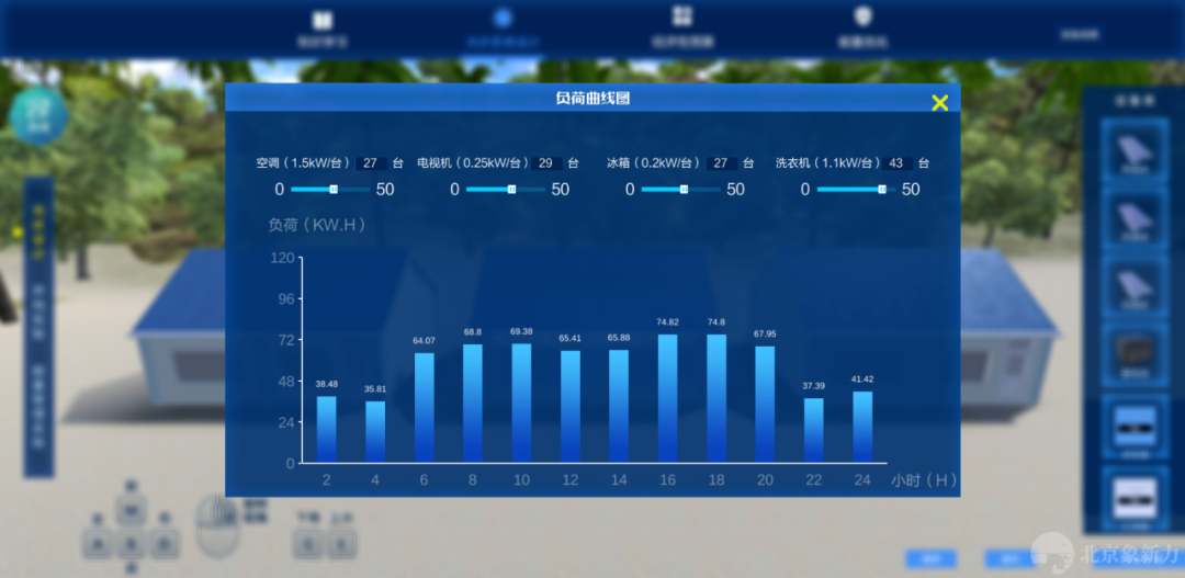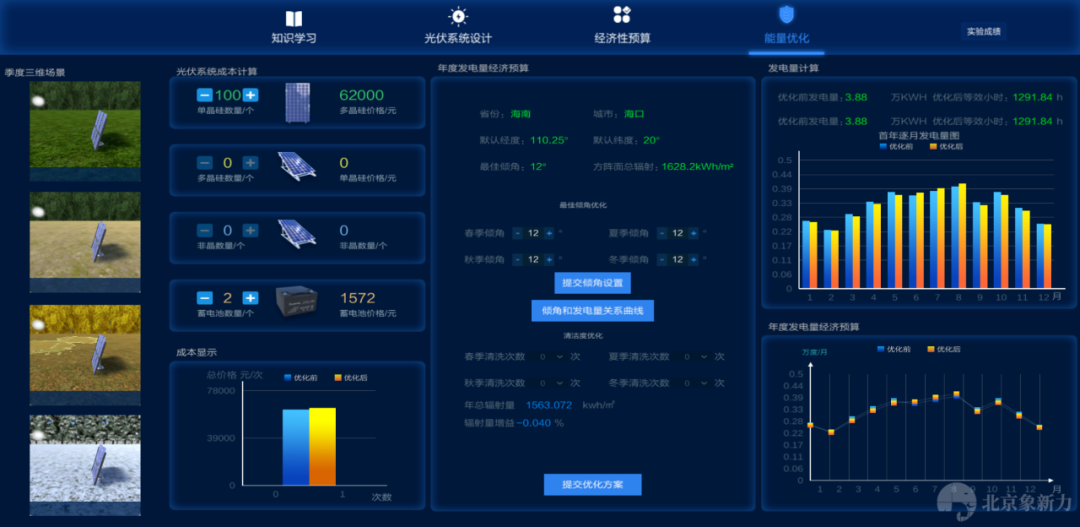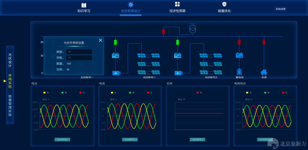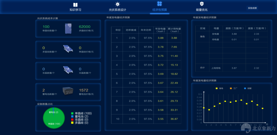 分布式光伏认知选型及设计运行虚拟仿真软件,首先学习电池组件的构成、制备过程,光伏系统的各组成部分等基础知识,再通过实验方法掌握不同组件的光伏特性,并从中了解其开路电压、短路电流、填充因子和转换效率等重要参数。其次,根据不同场景实际负载的需求,上海市每个月阴雨天气数和日平均用电量,计算出需要的蓄电池的容量。根据蓄电池的型号参数,计算出蓄电池的数量,并进行安装。最后,学生以上述条件自行设计一套能够满足各项要求的光伏发电系统,并能根据此系统进行必要的经济性测算。