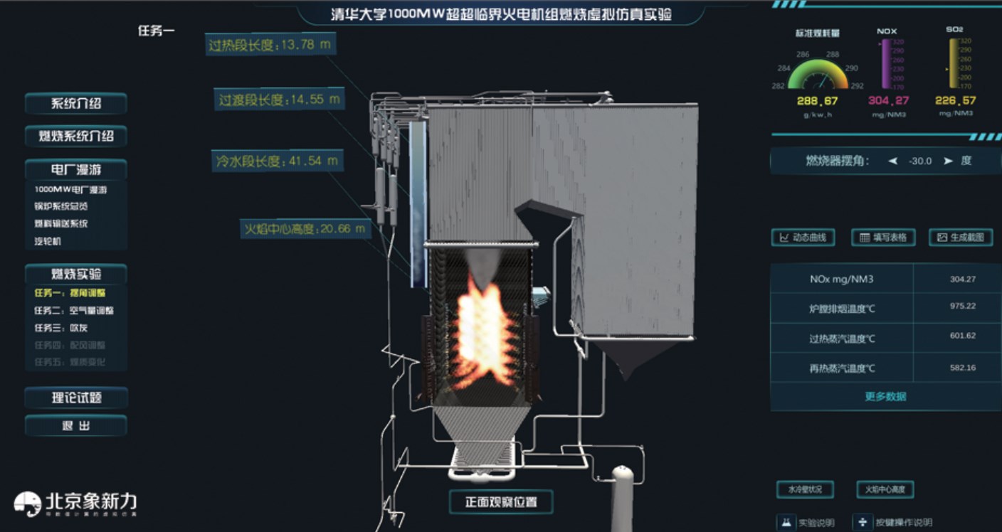 1000MW超超临界火电机组燃烧系统虚拟仿真软件由燃烧系统设备、系统组成、工作原理、燃烧系统与设备的工作流程仿真。通过三维建模,建立燃烧系统详细三维模型;提供基于机理仿真的燃烧系统数值计算的数学模型,供学生结合DCS监控画面进行燃烧调节,从而开展燃烧系统与设备的认知实习及仿真操作。通过实验,可达到使学生充分了解设备与系统的动静态特性、进行仿真结果的验证及进行虚拟的现场试验的教学目的。