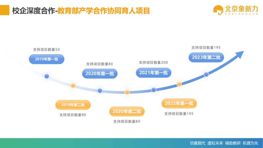 北京象新力科技自2019年以来,已连续5年深度参与并开展协同育人项目,支持的项目数量累计达到了775项,积极探索应用人才培养方式,致力于帮助更多院校提升面向方向包括:智能制造、材料工程、有限元分析、电气工程、机器人仿真、流体力学、自动化、新能源、人工智能、化学化工、数字孪生、能源动力、智能制造、储能技术、能源产品与市场、环境工程、食品工程、土木工程、建筑环境与能源应用、机械设计与机械原理、工业互联网等专业方向人才培养能力,全方位推进高等教育产教融合,为推动高等院校教育教学数智化转型贡献力量。