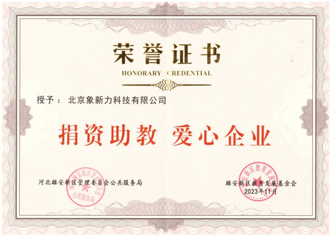 雄安新区教育发展基金会,通过接受北京象新力定向捐赠,在新区开展“雄安支教团励志奖学金计划”,每年度由支教团成员每人推选一名新区优秀高中学生进行奖励。计划旨在为支教团成员提供更多的资源和支持,激励支教团成员更加努力投入到教育事业中,为新区的教育事业发展贡献力量。