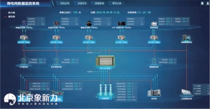 本实验平台采用多种能源模拟供电方式,发电系统主要包括薄膜电池、单晶电池、多晶电池及HJT双面电池、风力发电机、铅炭储能电池、共直流母线光储一体机、太阳能光热系统等几部分;能量管理系统可根据用能及试验完成相应功能测试,并将采集到的数据通过网络通讯,展示在平台界面上。具有发电优化调度、负荷管理、实时监测并自动实现微电网同步等功能。采用MODBUSTCP通讯协议和中央控制器交互数据,进而实现数据存储,可以轻松地将所有微电网教学实验平台数据统一为一个功能全面的数据可视化系统。