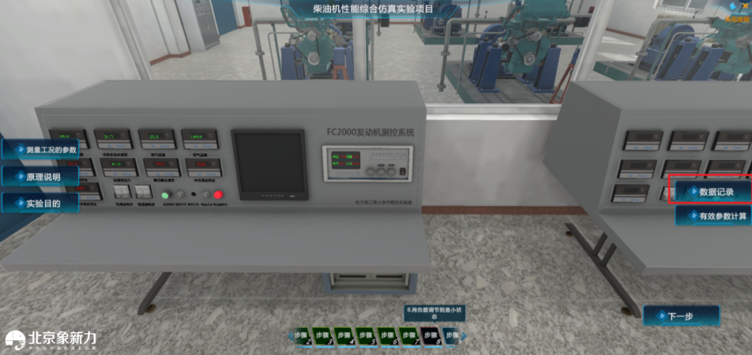 实验以真实实验室设备及场景为对象,通过虚拟仿真操作的实现对设备的基本原理及使用方法、实验前的准备工作、启动、加负载、测量与记录、卸载与停机、、实验数据整理分析、实验报告提交等操作步骤的模拟。同时嵌入设备手册、工作原理说明等信息,以三维仿真模型及图文结合的方式,实现对设备结构及使用的高效实验教学。实验以实时仿真数据模型为后台,数学模型严格遵循相应的公式及原理,和三维虚拟现实技术相联系,可通过发动机启停、开关调节等基本操作过程修改数学模型的参数,并实时计算和显示压力、温度等参数。