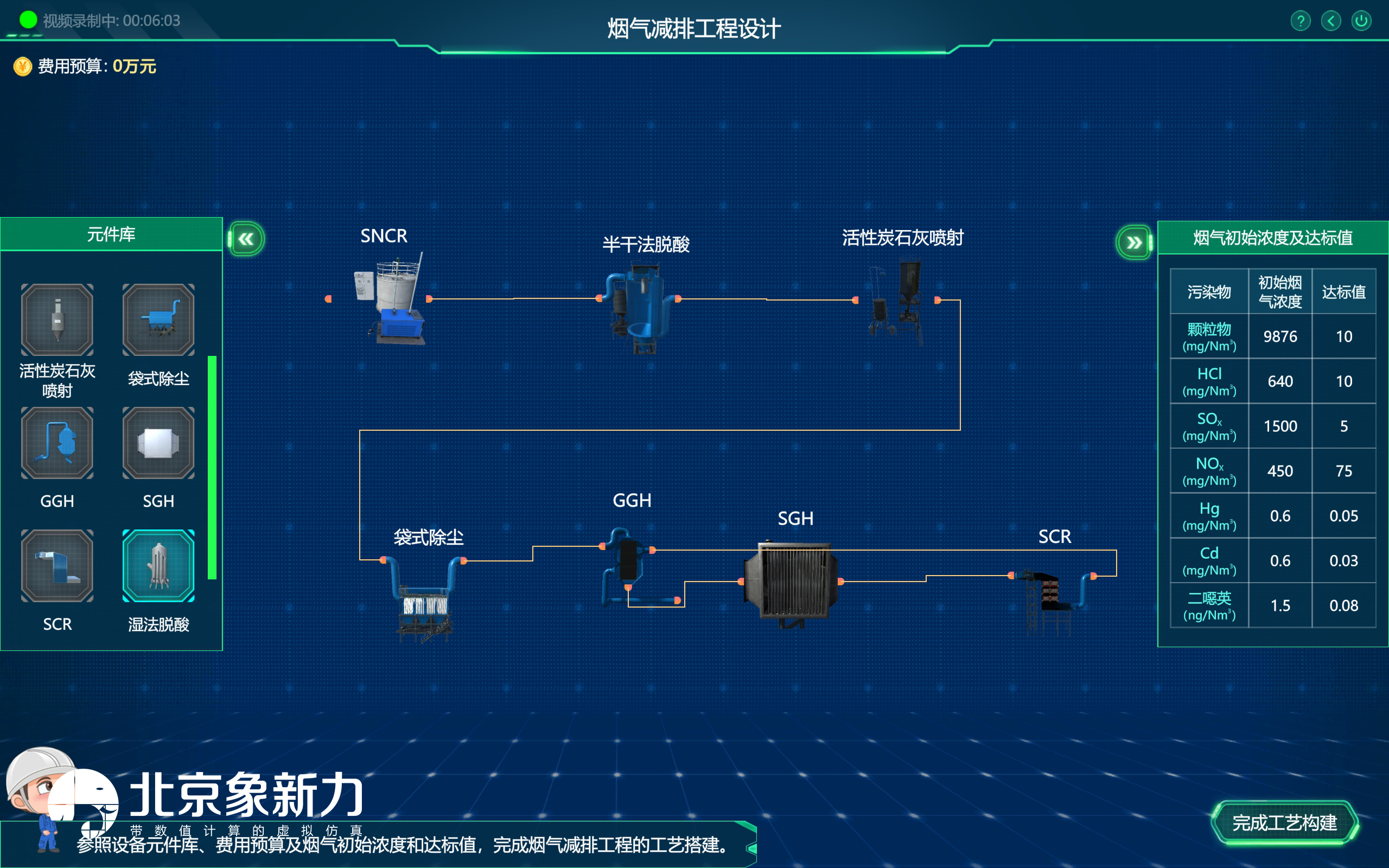 烟气减排工程设计模块 ,学生需先对垃圾入场、分选及焚烧进行了解,确定 进入烟气净化系统的烟气初始指标浓度。根据烟气初始指标浓度 ,选择合理的烟 气净化设备进行工艺搭建设计,搭建过程中要同时考虑搭建工艺的处理效率以及 经济合理性。