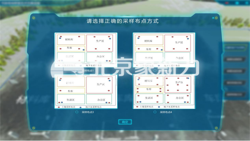 软件设置化工厂、冶金厂、塑料包装厂、电子厂及制药厂等5种不同的污染场地,学生选择任意选择一个场地进入实验。选择布点方式,对场地的土壤及地下水进行采样调查。