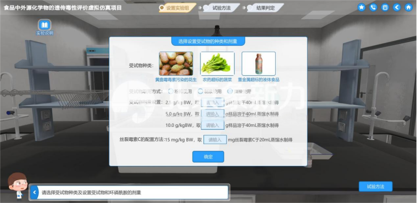本实验是以动物实验室组成、管理及遗传毒性试验设计、操作为原型,以解决实际教学问题为目标,综合利用3D建模、动画、计算机仿真、网络通信、动物实验室管理与遗传毒性试验技术等研制而成,为学生提供了一个真实的动物实验场景实验平台。