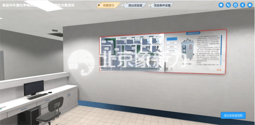 实验认知模块包括场景预习、进出实验室和实验条件设置。
