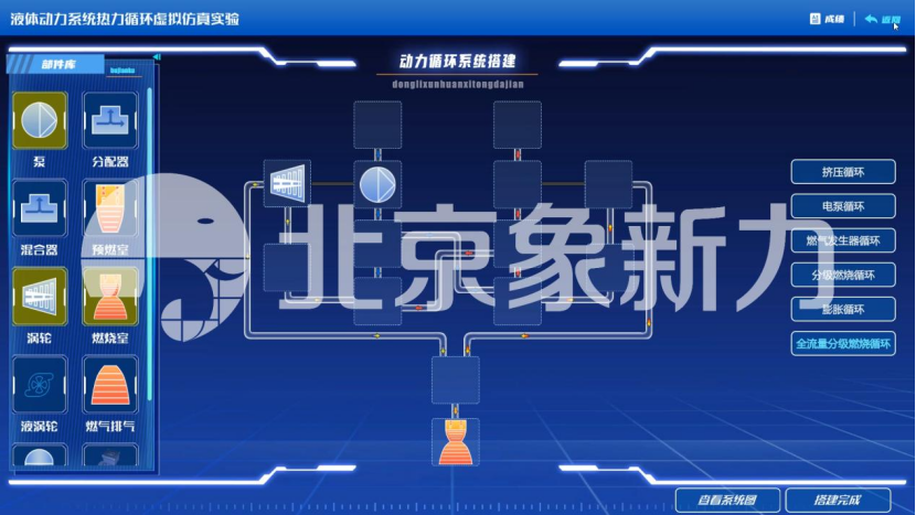 本实验将所有火箭发动机上的设备作为模块提供给学生,定义一套闭包性图形化建模语言。软件支持学生自由设计,自由搭建,自由探索,自由构建火箭发动机的动力循环系统。同时内置庞大模块化组件库,同时支持用户自定义模块。