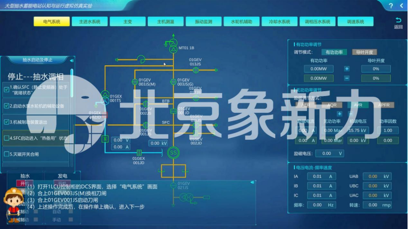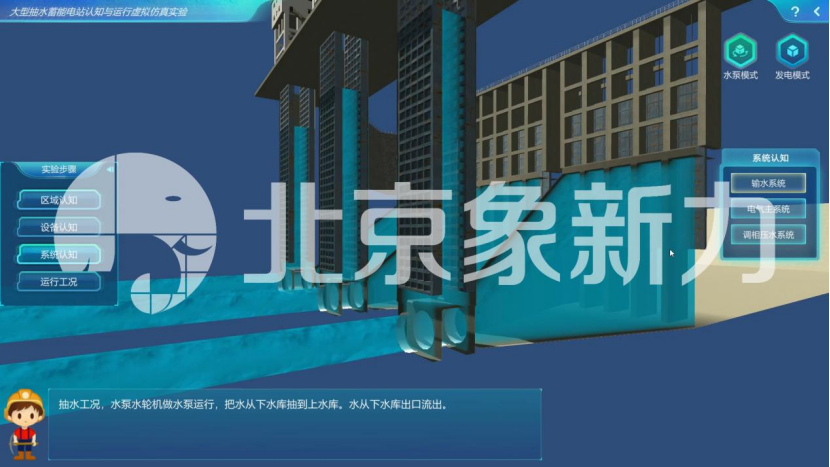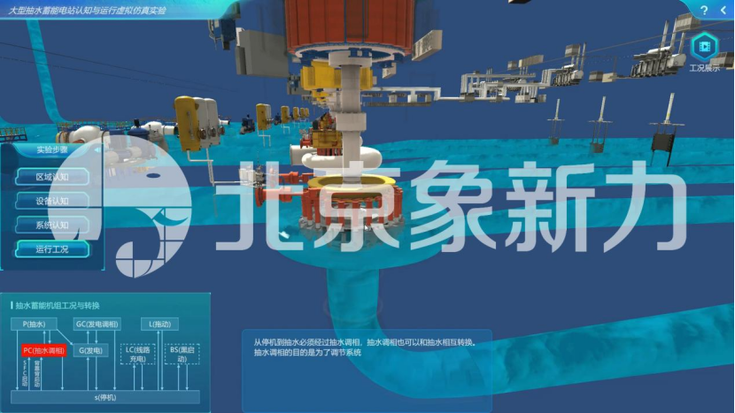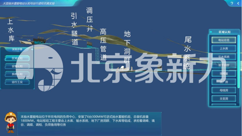 软件实验包括抽水蓄能电站区域认知、设备认知、系统认知、运行工况认知、发电运行操作、抽水运行操作六个模块。