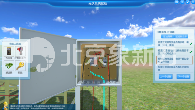 光伏电站智能化运维虚拟仿真实验软件聚焦光伏电站全流程运维管理,构建了高度仿真的运维场景。通过虚拟操作流程与真实运维逻辑深度融合,帮助用户掌握电站运维核心技能与应急处理能力。