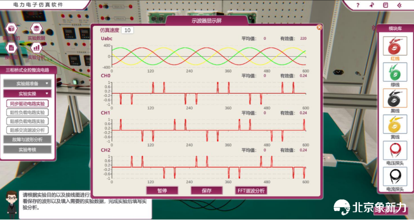 通过仿真模拟,实时观测各类电力电子电路的工作波形,并能通过数据处理工具(如FFT分析)对波形进行深入分析。