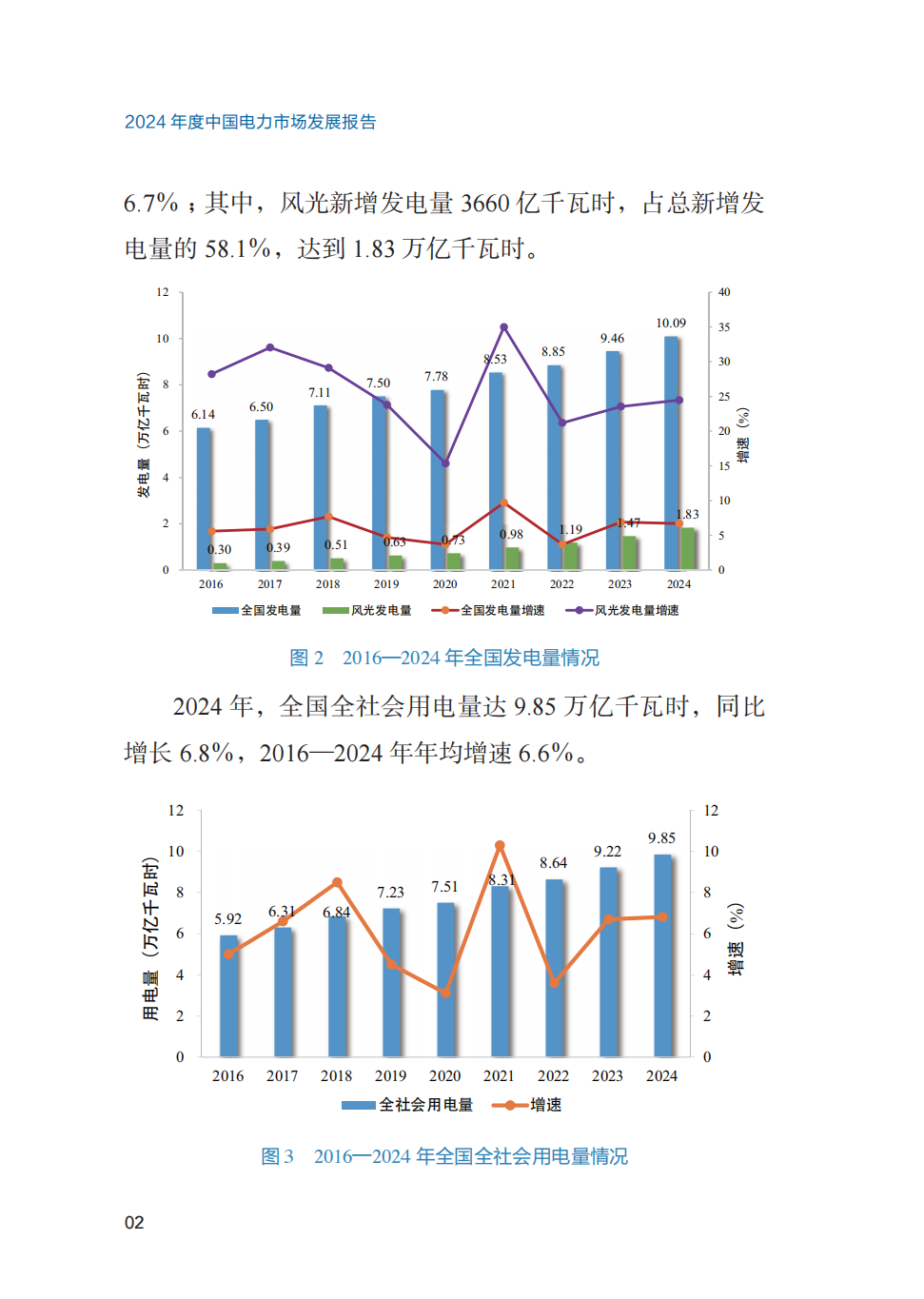 7月17日,国家能源局网站发布《2024年度中国电力市场发展报告》。其中指出,2024年,全国累计发电装机容量达33.49亿千瓦,新增发电装机容量4.29亿千瓦;其中,风光新增发电装机3.58亿千瓦,累计达14.07 亿千瓦,同比增长33.9%。2024 年,全国发电量10.09万亿千瓦时,同比增长6.7%;其中,风光新增发电量3660亿千瓦时,占总新增发电量的58.1%,达到1.83万亿千瓦时。2024年,全国全社会用电量达9.85万亿千瓦时,同比增长 6.8%,2016—2024年年均增速 6.6%。