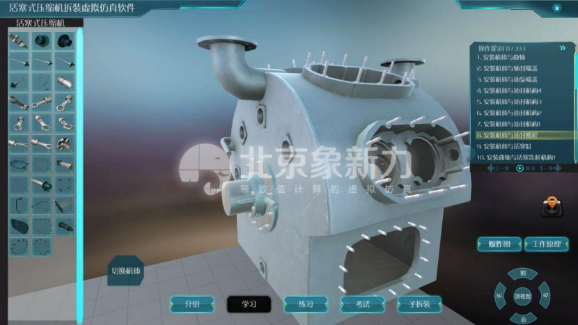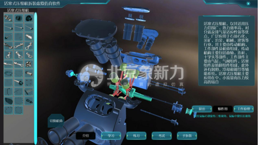 系统提供了活塞式、单螺杆式、双螺杆式、涡旋式、离心式这 5 种常见类型的压缩机供学生拆装学习。并且针对每种压缩机的拆装,都设置了介绍、学习、练习、考试 4 种模式。