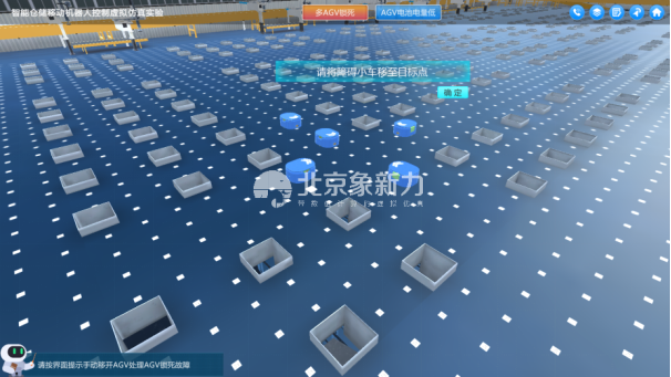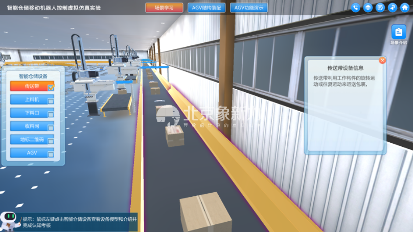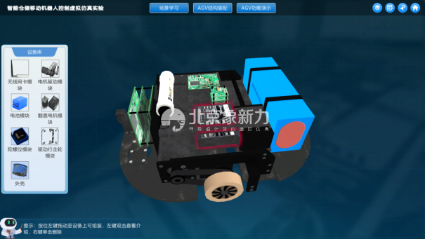 用户选择“系统学习”模块,使用鼠标和键盘在场景中进行漫游,可以快速将视角定位到选中的设备并查看对应的设备介绍。同时还可以拖动设备库中的设备安装到 AGV 的对应位置中,查看 AGV 结构及结构原理。