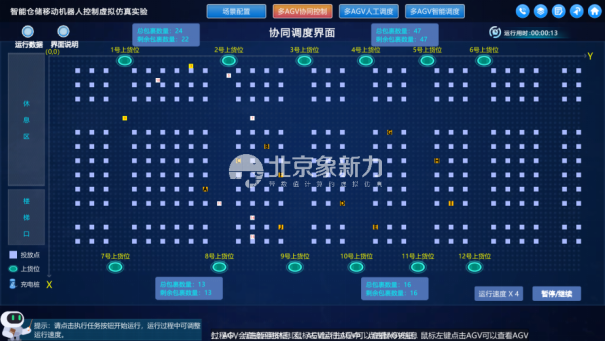 用户选择“多 AGV 协同调度”模块,可进行场景配置,使系统能够在最短时间内完成全部包裹的投放。还可进行多AGV 协同控制、多AGV人工调度、多AGV智能调度实验。