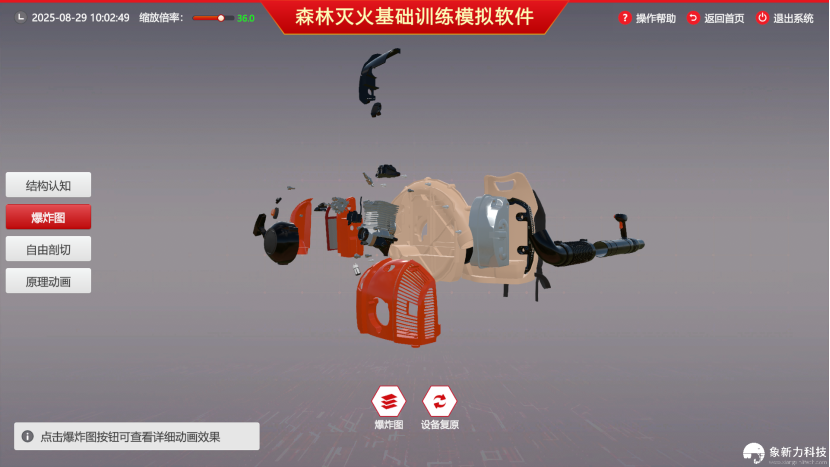 该系统通过高精度三维建模,精准还原设备内外结构及实际操作流程,不仅使消防人员能够深入理解设备原理与运行机制,更显著降低了实体装备的维护成本,有效提升对各类故障的判断识别与应急处置能力,从而全面优化训练与维护模式,为培养专业化应急消防人才提供高度安全、高效可靠、可重复使用的智能训练新路径。
