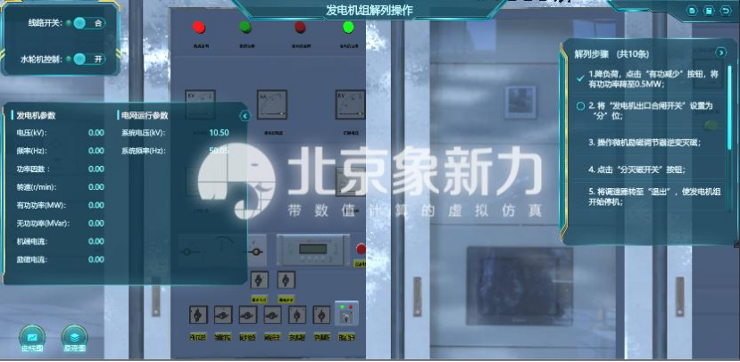 系统提供发电机解列操作界面,学生需根据右侧解列步骤逐步操作,完成降低负荷、分闸、停机等一系列实验步骤。