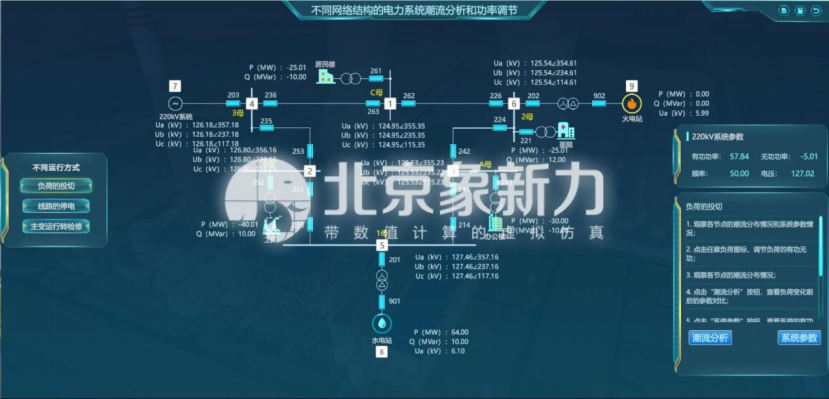 学生通过改变IEEE9节点系统图中断路器的开合、负荷的功率及发电厂的功率,查看数据变化,完成不同运行方式下的电力系统潮流分析和功率调节。