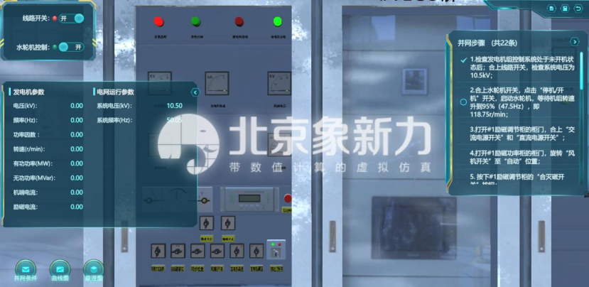 北京象新力针对该电力系统调度实验教学内容复杂、抽象的特征,将理论与实践相结合,开发了“发电机组并网及电力系统功率调节虚拟仿真软件”。通过虚拟仿真技术解决了现实中电力系统调度实验具有巨大人身安全风险、巨大生产安全风险,和不易展现复杂调度过程效果的问题,让学生在逼真的三维水电站场景中亲身体验发电厂并网离网过程,全面理解调度知识,培养工程实际有功调度能力。