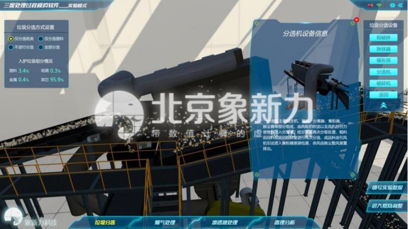 北京象新力根据《三废处理工程技术手册》等课程的教学内容,以国内先进的生活垃圾处理处置方法为设计原型,研发了环境工程三废处理虚拟仿真软件,模拟实际的垃圾焚烧工艺,以及二次污染物处理工艺,提供真实的工程场景实验平台,提高学生实际工程能力,培养创新意识。