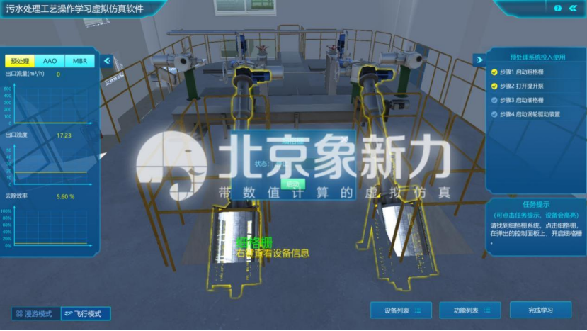 在任务栏中依次领取故障任务,任务包括膜组件出水不达标、AAO溶解氧偏低和污泥回流比异常等,任务领取后进入操作。进入故障任务三维场景,根据实验引导完成故障任务的处理,培养学生对污水处理厂常见异常情况的处理能力。