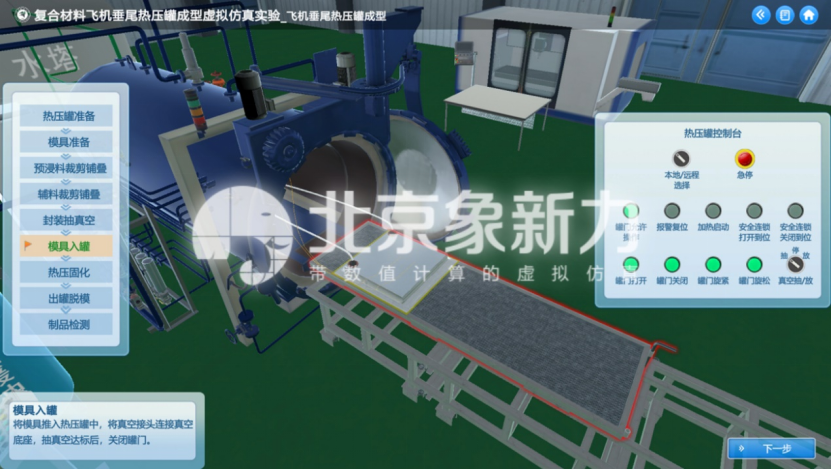 为此,北京象新力自主研发了“复合材料飞机垂尾热压罐成型虚拟仿真软件”。软件以碳纤维增强环氧树脂复合材料在飞机垂尾上的应用为例,通过虚拟仿真实验的操作与学习,帮助学生全方位掌握复合材料典型制备工艺,为复合材料高端制造领域的研究与应用工作奠定坚实的综合能力基础。