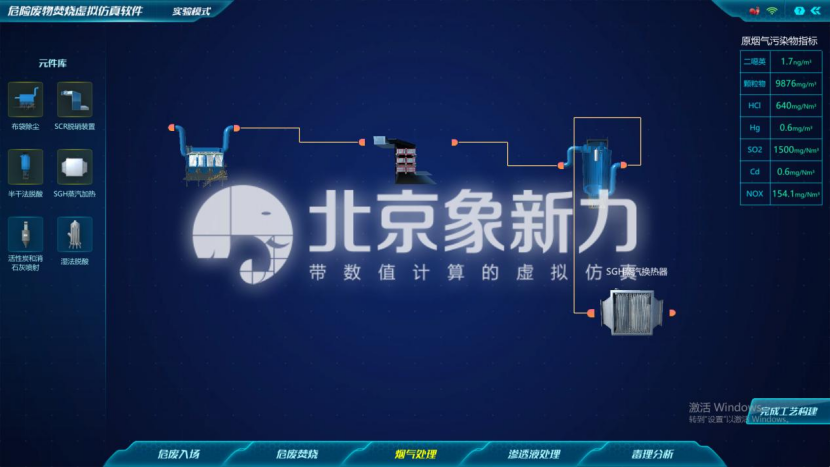 在焚烧调整环节中,可自行选择危险废物分选方式和危险废物组分含量。并通过实验学习和认识在焚烧之前焚烧物的热值测定过程。在焚烧过程中,根据选择危险废物的状态展现不同焚烧炉的效果,并可调节焚烧炉参数来调整焚烧炉的燃烧温度,并以此调节焚烧中产生的烟气污染物浓度。